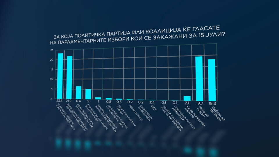 Анкетата на Телма, ИЦДС „Социетас Цивилис“ и „М – Проспект“ – која ја објавуваме на стартот на изборната кампања покажува дека за коалицијата можеме предводена од СДСМ се определиле 23, 5 % од испитаниците, за Коалицијата за Обнова на Македонија 21,9 проценти, За ДУИ се определиле 6,4 %, а за Алијансата на Албанците и Алтернатива 5%.