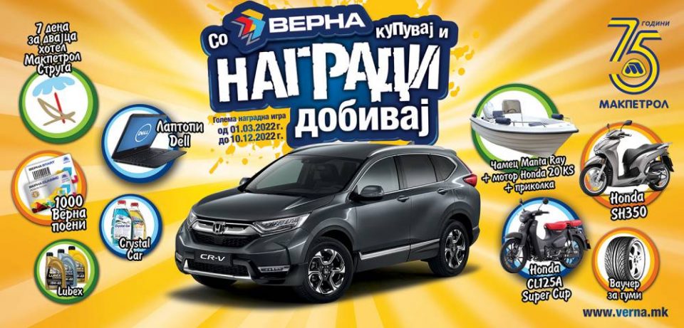 Како и во десегашните Верна наградни игри, условите за учество остануваат непроменети. Со најмалку 10 поени впишани на Вашата Верна картичка ќе бидете потенцијален добитник на лаптоп DELL, ваучер за гуми, ваучер за Лубекс моторни масла, ваучер за Кристал Кар средство за ветробрански стакла и Верна наградни поени. Во текот на наградна игра ќе ги доделиме следните главни награди: три награди 7 дена за двајца во хотелот на Макпетрол во Струга, 2 моторцикли Honda, гумен чамец заедно со приколка и вонбродски мотор Honda и финалната мастер награда – современата Honda CR-V Elegance.