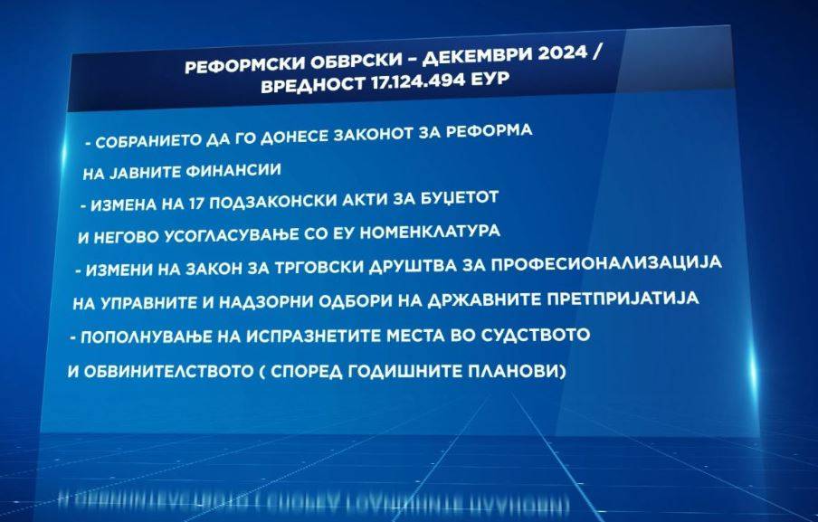 По принципот реформи за пари, за да ги добие 750 милиони евра, Владата ќе мора почнувајќи од годинава до август 2027-ма да спроведе реформи во пет области, со носење на 37 реформски закони и стратегии и тие да се спроведат низ 137 конкретни мерки.