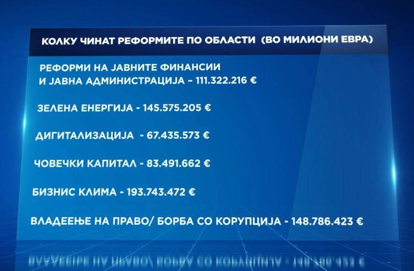 Во Планот за раст всушност, секоја реформа има своја цена, како и секоја мерка за нејзино спроведување. Па така, сите реформи што треба да се спроведат до август 2027 година во јавните финансии и администрацијата чинат околу 111 милиони евра, за зелена енергија – 145 милиони, за дигитализација – 67, за владеење на правото – 148 милиони. Но, ако институциите се амбициозни и успешни, ќе можат на пример, и порано да повлечат пари кои биле предвидени за 2026 или 2027 година, ако предвреме ги завршат реформите.
