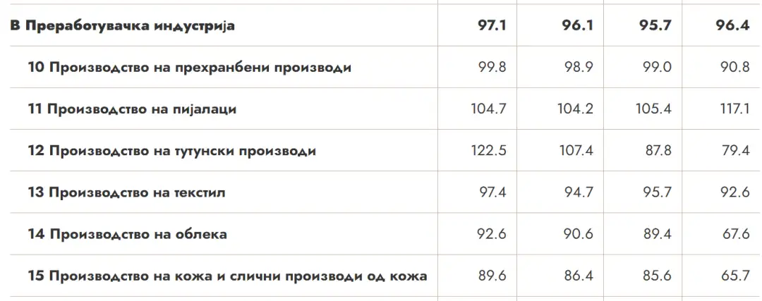 Во септември 2025 во однос на септември 2024 има намалување од 2,9 проценти на работниците во секторот Преработувачка индустрија, од 2 проценти во Рударство и вадење на камен и од 0,6 проценти во Снабдување со електрична енергија, гас, пареа и климатизација.