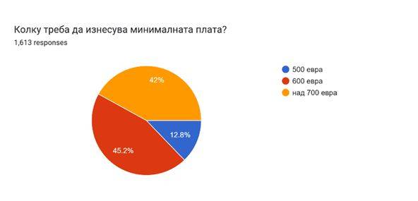 На прашањето Колку треба да изнесува минималната плата, од 1613 одговори 45,2% сметаат дека минималната плата во Македонија треба да се зголеми на 600 евра, 42% од испитаниците сметаат дека истата треба да изнесува над 700 евра, а 12,8% од испитаниците сметаат дека минималната плата во Македонија треба да изнесува 500 евра.