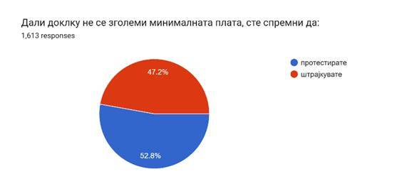 52,8% од испитаниците (работници, граѓани, членови на органите и телата на синдикатите) доколку не се зголеми минималната плата се спремни да протестираат, а 47,2% се спремни да штрајкуваат, односно сите испитаници сметаат дека доколку не се зголеми минималната плата треба и да се протести и да се штрајкува.