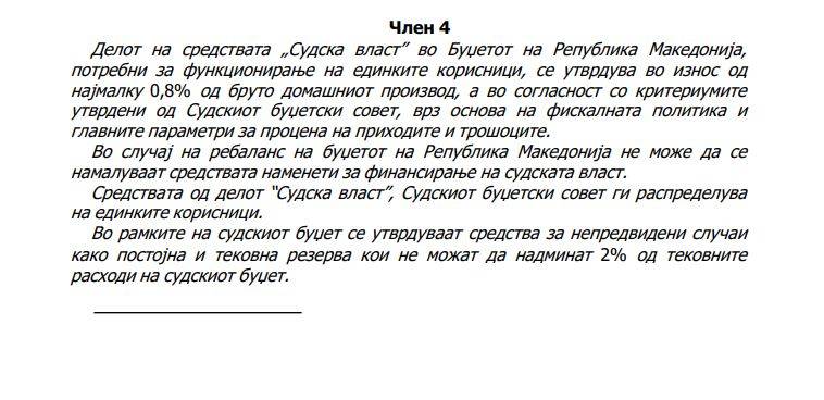 Сепак, на прашањето зошто не се почитува Законот за судски буџет, во чиј член 4 е наведено дека буџетот треба да биде најмалку 0,8 отсто од БДП, премиерот тврдеше дека тоа ниво е до 0,8 проценти. Еве како гласи членот 4 од законот за судски буџети.
